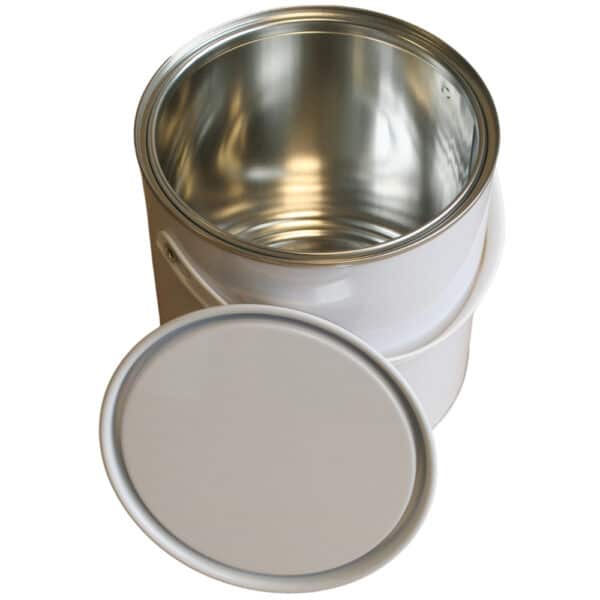2.5 litre (0.55 gallon) white external and plain internal lever lid tin with handle.
